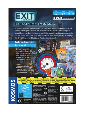Was für ein Fund! In einem Brief taucht der Hinweis auf ein bisher unbekanntes Meisterwerk Vincent van Goghs auf. Die 1-4 Spielerinnen und Spieler stürzen sich sofort ins Abenteuer. Sie kombinieren Codes, suchen verborgene Orte und lösen Rätsel. Bei ihrer Mission in diesem EXIT® - Das Spiel sind sie nicht allein: Ein gefährlicher Verfolger ist ihnen dicht auf den Fersen. Eine aufregende Jagd durch die Straßen und Grachten Amsterdams beginnt. Dem Team ab 12 Jahren bleiben nur 45-60 Minuten, um das Gemälde zu finden. Die Spannung steigt!