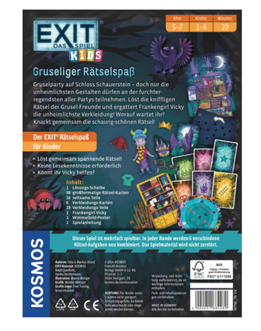 Gruselparty auf Schloss Schauerstein! Nur die unheimlichsten Gestalten sind zu dieser furchterregendsten aller Partys eingeladen. Auch Frankengirl Vicky möchte unbedingt mitfeiern. Sie braucht nur noch eine gruselige Verkleidung. Die muss aber zuerst errätselt werden! Zum Glück helfen ihr dabei ein bis vier Kinder und lösen alleine oder gemeinsam im Team schaurig-lustige Rätsel. Verschiedene Rätselarten werden Runde für Runde mit Hilfe von Rätselkarten und Lösungsscheibe neu kombiniert. Das Spielmaterial bleibt dabei erhalten: EXIT® – Das Spiel für Kinder ab fünf Jahren ist wiederspielbar. Großes Grusel-Abenteuer, großer Rätselspaß!