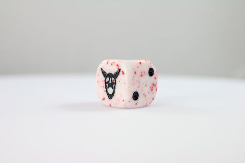 Rein wie frischer Schnee, befleckt vom ersten Blut. Die Bloodtithe Bone Würfel tragen ein schaurig schönes Muster aus weißen Flächen, gesprenkelt mit tiefroten Tropfen – als wären sie Zeugen eines uralten Opferrituals. Die Sechs ziert das Symbol einer gehörnten Totenschädelmaske, das Emblem eines uralten Bundes, geschmiedet in Wahnsinn und Ewigkeit. Perfekt für alle, die den Tod nicht fürchten, sondern ihn führen.