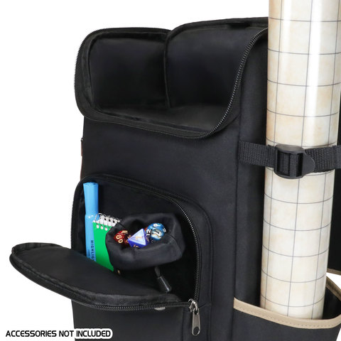 Elevate your tabletop style with this Designer Edition DnD Backpack where fantasy meets fashion. Crafted with premium materials and intricate embroidery inspired by arcane sigils and mythical beasts, this bag is more than just storage — it's a statement. Every campaign with the ENHANCE Tabletop Designer Edition RPG Backpack, meticulously crafted for the discerning dungeon master. The vegan leather accents and the aesthetic of this fashionable backpack makes it perfect for travelling from the park to game night. Its vault-style interior stands upright to cradle 3-4 hardcover rulebooks. Customizable foam trays protect and showcase your miniatures, and a front accessory pocket keeps dice, tokens, cables, and snacks organized.