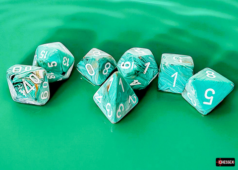Contains 7 Marble Oxi-Copper™ Dice with white numbers in the following Shapes: