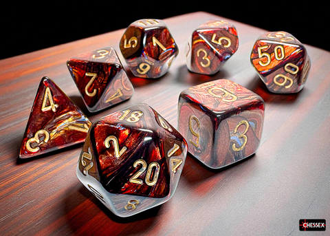 Contains 7 Scarab Blue Blood™ Dice with gold numbers in the following Shapes: