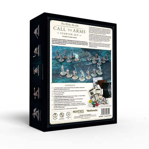Begin your adventures in Tamriel with this essential boxed Starter Set collection. Containing the full rules of the The Elder Scrolls: Call to Arms, plus three miniatures starter packs and the Dragonborn Ethereal!