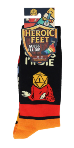 The "Guess I'll Die" pattern features an oversized d20 showing a one paired with a bold, tongue-in-cheek slogan in a retro comic style. The graphic layout is designed to be a clear statement piece that still works with casual outfits, making these socks a great gift for players with a sense of humour and a taste for dramatic moments.
