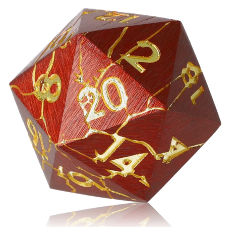 This shiny red dice set features bright golden numbers and cracks! Infused with mercury’s eldritch flame.