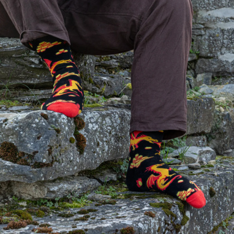Heroic Feet brings you the Greedy Dragon Socks, trusty companions for every step of your journey. Crafted from a blend of 70% cotton, 27% polyamide and 2% elastane, they deliver softness, durability where needed and a snug, secure fit. Perfect for long gaming nights, busy markets or some new quest.
