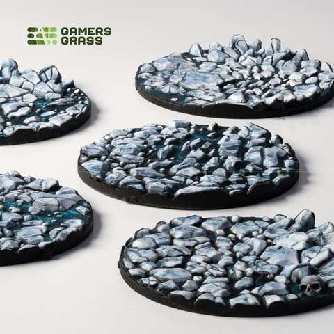 This blister contains 5 thermoplastic toppers made for 40mm round bases, in a Frost Lake theme. All Battle Ready Toppers are sold already painted."