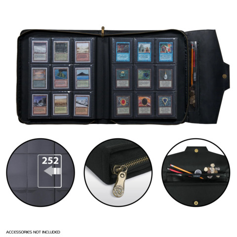 Our card toploaders card binder stores up to 252 cards in individual card pockets on sewn-in pages. Each of the 14 pages is double-sided and has a soft black partition in the middle to protect the cards from rubbing or sticking. Pages have 9 card pockets arranged in 3 rows and 3 columns, ideal for storing 3 copies of the same Magic the Gathering card in one row. Compatible with MTG, YuGiOh!, Digimon, Baseball, Football, Basketball cards.