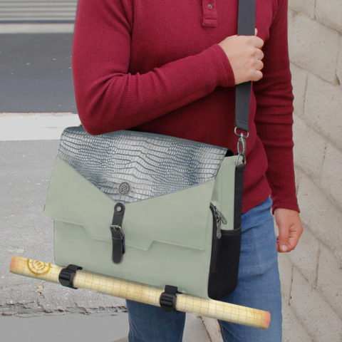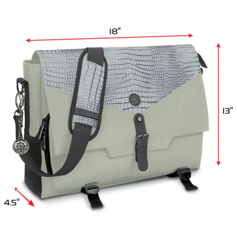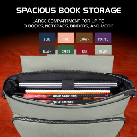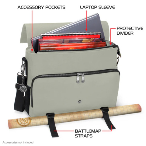 The messenger bag style design offers incredible versatility and comfort. The familiar design is comfortable to wear even throughout long days on campus, at work, or at conventions. The interior features a thick padded divider to help organize your character's gear and includes enough space for up to 4 rulebooks, or a combination of binders, journals, folios, and more. Opposite of the divider is a special compartment with an elastic security strap designed to hold laptops and tablets in place during travel. The compartment accommodates up to 17 inch laptops, but can also store smaller devices or additional books and binders.