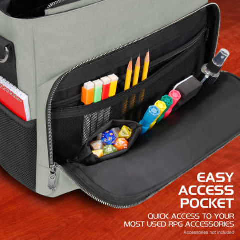 A very spacious front zippered pocket with another netted mesh zippered pocket inside is great for storing and organizing game materials such as dice, journals, tokens, pens, pencils, and much more. There are also extra side pockets on either side of the exterior of the bag perfect for holding other accessories such as large dice pouches. The RPG Essential's Bag features two adjustable battlemap carrying straps perfect for traveling with a rolled up battle grid or map.