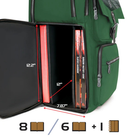 BUILT-IN RPG BOOK CELLAR – To master every battle, we forged a bookshelf-inspired vault suited to hold up to 8 upright RPG books. The side-loading book compartment of this DnD Backpack is built for easy access and organization of a Dungeon Master's essential RPG'ing library, from guides and rule books to reference binders and notebooks. The book cellar measures 21.2 x 12 x 7.87 inches.