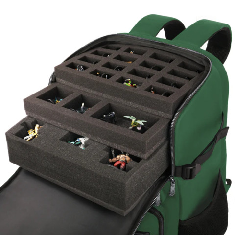 MINIS BARRACKS – The zippered compartment located at the top of the RPG Backpack comes with 3 integrated miniatures foam trays to house your collection of PCs, NPCs, monsters, and creatures. Tray #1 is a 16-slot tray for 28mm figures; Tray #2 is an 8-slot tray for medium-sized figures, and Tray #3 is a pick and pluck foam tray for custom mini storage.