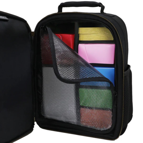 The front deck compartment is equipped with rigid flexible dividers in order to transport items such as small cardboard boxes, etc. or smaller items such as multiple deck box (up to 8 standard sized deck boxes), dice bags, packs and sleeves, and more. The choice of design is yours. Zip up the defender screen to ensure your items are snug and safe when opening up the main compartment, or from shifting around during travel. Front Deck Compartment Dimensions: 11.4 x 8.7 x 4.3 Inches