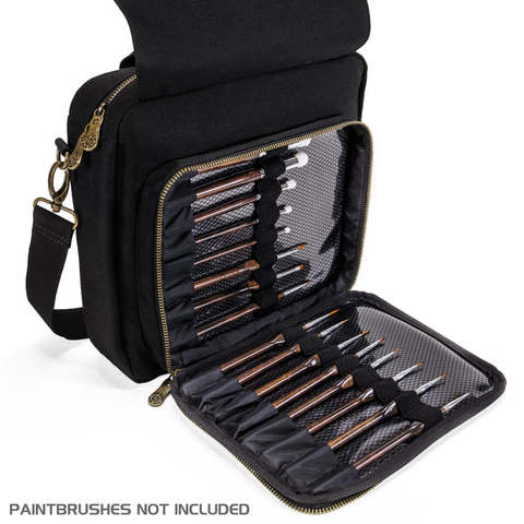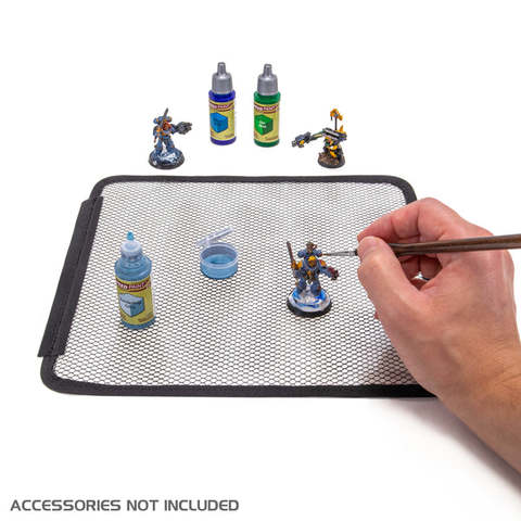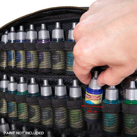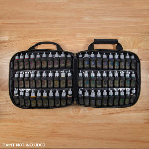 Meet your mobile paint storage station. The ENHANCE Miniature Paint Carrying Case (11.8 x 11.8 x 9.3 in) keeps supplies visible and ready. Front compartment holds 16 brushes while the main compartment organizes 60 paints in a "gallery" display for easy visibility of all your colors. A removable paint pad protects surfaces and wipes clean. Compact and travel-ready for Warhammer and other minis, it speeds setup/teardown and keeps your workspace tidy at home, the shop, or conventions