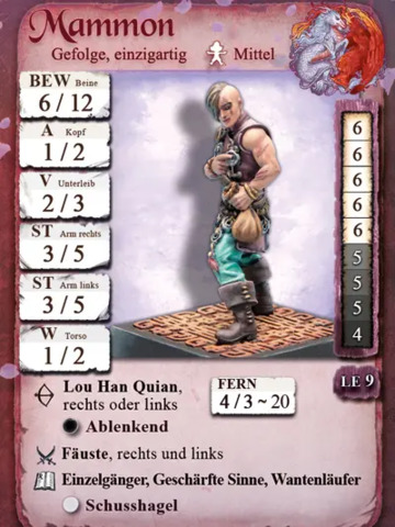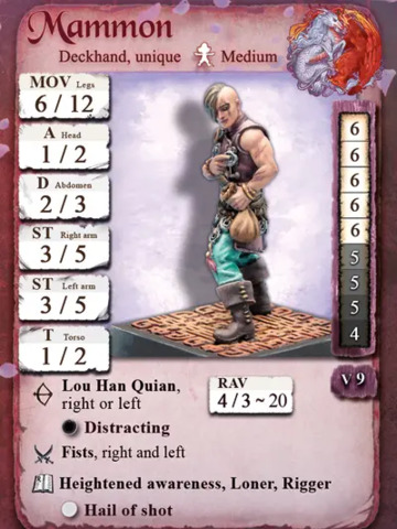 Mammon ist sehr geschickt mit den Fingern und seinen Lou Han Quians - seinen Münzen. Spezialanfertigungen mit extrem scharfen Kanten, und mit Schusshagel eine ernst zu nehmende Waffe. Und welcher anständige Pirat lässt sich nicht vom Klimpern einer Münze auf dem Pflaster der Straße ablenken?