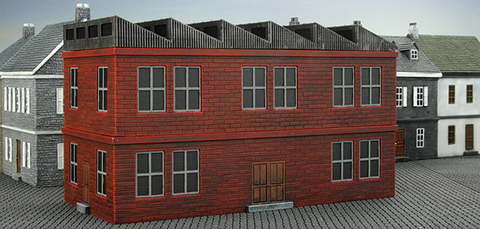 With design features like the saw-tooth roof and bare brick walls, this is a totally typical manufacturing plant or warehouse. It will look at home on battlefields for any period from the Industrial Revolution till today.