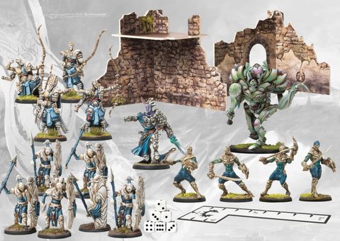 A First Blood Warband that is ready to assemble and play. Think of this as a 1 player starter for the new edition of First Blood. This box has 16 Spires Models, 6 Dice, Measuring Tool, 2 sets of 3D punch out Terrain (of a randomly assorted mix of 6 different types), a Quick Start and Welcome Guide, all needed Command Cards, Bases and Stands, and assembly manuals!