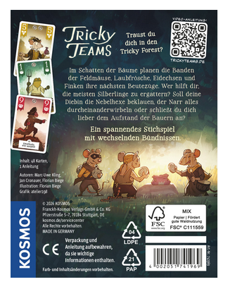 In jeder Stichrunde entstehen neue Allianzen, und jede Entscheidung kann den Spielverlauf verändern. Vier gewitzt illustrierte Tierteams mit Zahlenwerten von eins bis zehn und besonderen Fähigkeiten sorgen für überraschende Wendungen. Wer sich im richtigen Moment dem Gewinnerteam anschließt, sammelt Silberlinge. Schnelle Runden halten die Spannung hoch und machen das Spiel zu einem unterhaltsamen Erlebnis für Stichspielfans, Familien, Freundeskreise und alle, die eine Portion Teamgeist mit etwas Strategie verbinden möchten. Nach vier Beutezügen entscheidet sich, wer die meisten Silberlinge gehortet hat. Ab zehn Jahren.