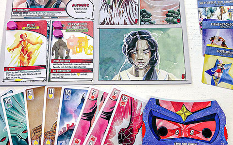 Hero Story ist ein Stichspiel über 5 Runden, das deine Entwicklung zum (Super-)Helden bzw. zur (Super-)Heldin erzählt. Zu Beginn jeder Runde fügst du deinem Tableau eine weitere Fähigkeit hinzu und entwickelst deine Kräfte so immer weiter.