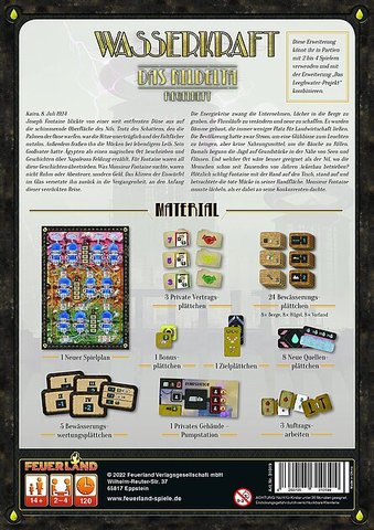 Ihr müsst euch entscheiden, ob ihr das kostbare Wasser zur Energieerzeugung nutzt oder damit Felder bewässert. Ihr könnt nun auch Wasser von eurer Staumauer in ein angrenzendes Tal auf Bewässerungsfelder leiten und so ein Bewässerungsplättchen erhalten. Durch die Bewässerungsplättchen erhaltet ihr Bewässerungspunkte und einmalige Zusatzaktionen, die ihr während der Spielzüge mit eurer Hauptaktion kombinieren dürft.