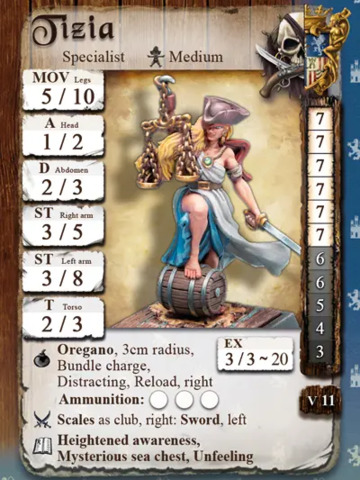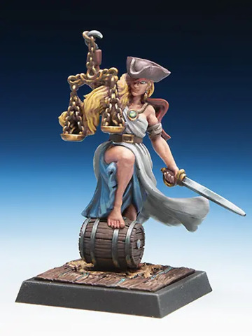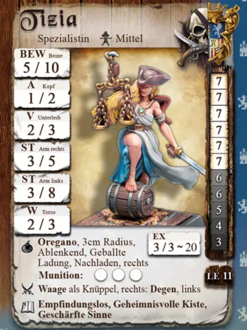 Der Metall-Figur liegt die Charakterkarte mit allen für Freebooter’s Fate benötigten Spielwerten bei. Die Figur wird unbemalt und in Einzelteilen geliefert und muss noch zusammengebaut werden.