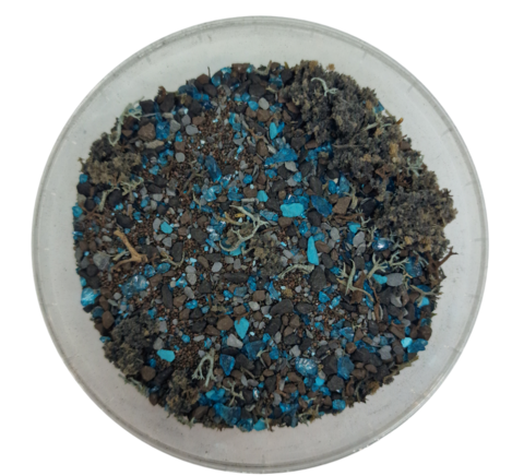 Türkise Kristalle und Geflecht brechen die dunklen Erdtöne auf und verleihen der Base einen fremden, fast südhangartigen Look, als würde hier eine unbekannte Energie direkt aus dem Boden wachsen.