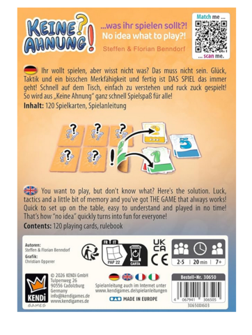 Ihr wollt spielen, wisst aber nicht was? Das muss nicht sein. Glück, Taktik und ein bisschen Merkfähigkeit – und fertig ist das Spiel, das immer geht! Schnell auf dem Tisch, einfach zu verstehen und ruckzuck gespielt! So wird aus „Keine Ahnung“ ganz schnell Spielspaß für alle!