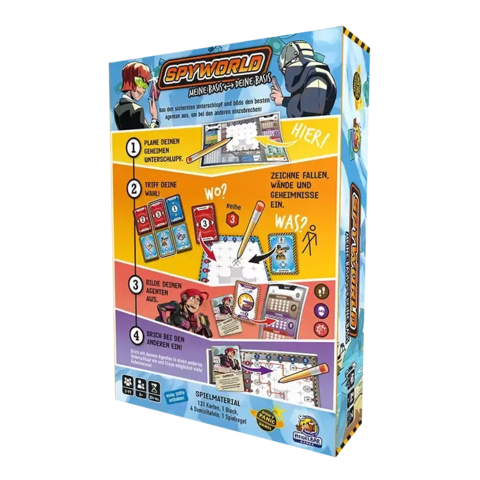 Spyworld ist ein Spiel für Familien und größere Gruppen bei dem es darum geht, eine geheime Basis zu errichten und die Weltherrschaft an sich zu reißen.