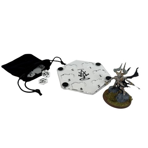 Durchdachtes Design für Lumineth-Spieler: Die zentrale Konsole ermöglicht es dir, die verwendete Rune für jede der 5 Schlachtrunden zu markieren. Dabei wurden alle Armeemechaniken berücksichtigt: Falls du den Erzmagier Teclis aufstellst, bietet die Konsole einen zusätzlichen Platz für die Extra-Rune, die er dem Heer verleiht. So sind alle strategischen Optionen abgedeckt.