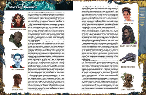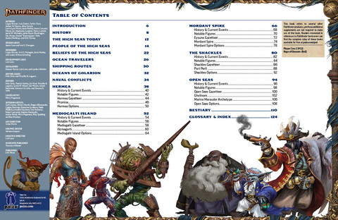 Set a course for grand adventures with this expansive hardcover guide to the open waters of the Inner Sea. Since time immemorial, the people of Golarion have been setting out into the sea to gather resources, ply their trades, and seek secrets both above and below the water. Explore the failed utopia of the island of Hermea, the home of deadly Red Mantis assassins on Mediogalti Island, the mysteries of the Mordant Spire grown from the remains of a dead god, the countless pirate-scoured islands of the Shackles, or the dangerous depths of underwater regions. Each entry within this gazetteer includes the history, culture, and current events of the region, as well as a major city to include in a variety adventures. The book also includes new character options and a fold-out poster map!