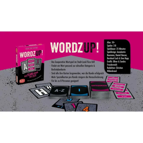 Haariges Wesen mit T? Tasmanischer Teufel! Ungewöhnlicher Beruf miz G? Golfballtauchen! Die erstbeste Antwort muss sofort raus. Denn als Team steht ihr unter großem Zeitdruck, alle Buchstaben mit passenden Wörtern zu versehen. Und bei den Spezialkarten, die jede Runde dazukommen, müsst ihr dann auch noch blitzschnell um die Ecke denken! Besteht ihr bis zur letzten Runde?