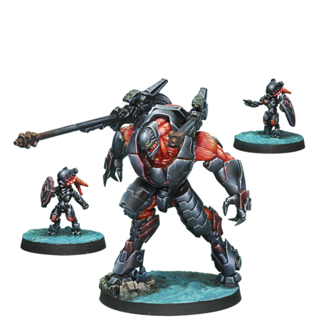 This box is a rebranded repack for the Essentials product line. This pack includes three metal miniatures: a Overdron and two TinBots, which provide an improve defense against Hacking Attacks and make them the perfect hunter of troops with Multiespectral Visors. Created for combat, designed for destruction, the Overdrons are a perfect weapon of the Ur Hegemony. Your adversaries will never forget their first contact with this monster. This box set will serve as the spearhead of the force you started with the Combined Army Action Pack (REF: 281645-1211).