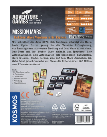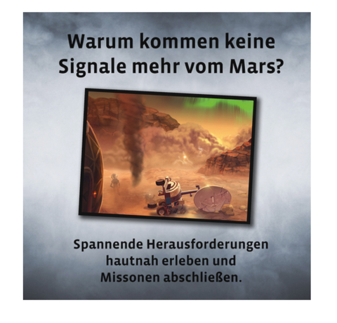 September 2076: Warum wurde seit Wochen kein Signal von der Marsbasis Alpha abgeschickt? Die Vereinte Erdregierung schickt eine Rettungsmission zur ersten Siedlung auf den Mars. Das Team: ein bis vier Spielerinnen ab zehn Jahren. Die Astronautinnen und Astronauten verfügen über besondere Fähigkeiten. Im analogen PC-Adventure in spannende Rollen schlüpfen und die Geschichte selbst erleben. Objekte suchen, kombinieren und Rätsel lösen: Viele Herausforderungen warten in über 100 Millionen Kilometern Entfernung. Die spannende SciFi-Story ist komplett hörbar mit der kostenlosen Kosmos Erklär-App.